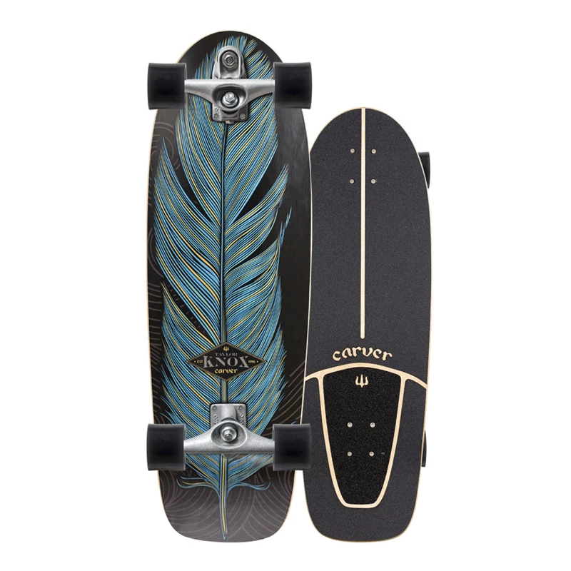 Taylor has been on the Carver team for nearly a decade, and during his tenure we’ve made numerous board models for him. His most popular by far has been the Fort Knox, a mid-sized deck with the wider spooned nose for extra forward foot placement. Everything is designed to work with Taylor’s style of power carving, so for 2014 we’ve made a few adjustments. First we added a quarter inch of length to this signature model and lengthened the wheelbase by 3/4″. It’s a subtle adjustment, but widening the stance and drawing out the carves by just a little bit makes this all-around board pump a bit faster. It still has the same easy pump and stable pushing properties, but with the added length Taylor has adjusted the stance so its even more closely matched with his surfing stance. This is important when using the board for surf cross-training, as it sets up good foot placement habits and proper muscle memory. Next we gave the template a fuller squash tail for a classic look and feel. And finally, we’ve kept the winged theme for his graphic, as well as his favorite blue and black colorway, creating a new Knox with the same classic vibe that Taylor has always had.