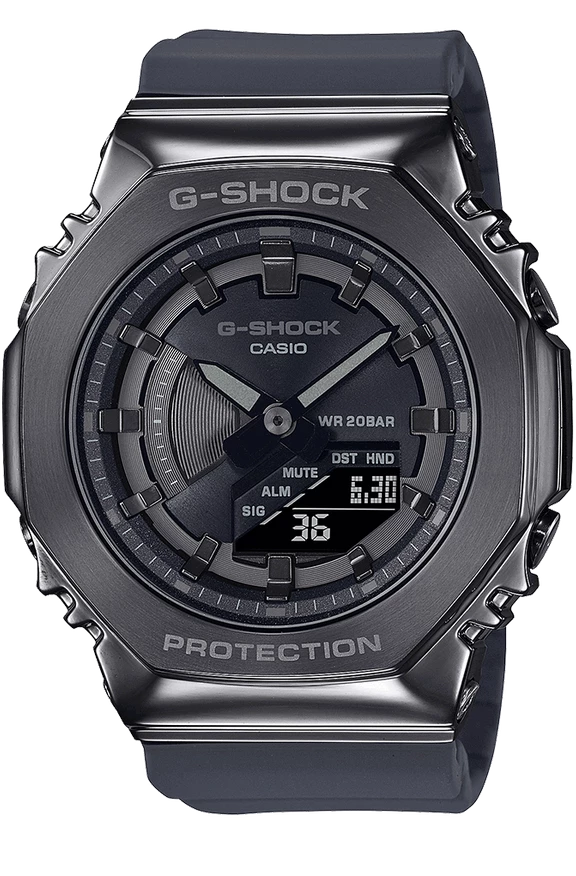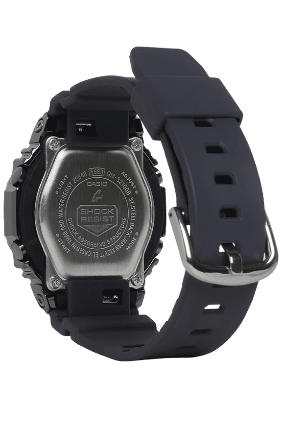 Go slim, clean and bold with a mid-sized black resin band GMS2100B-8A in a metal-clad octagonal take on the original iconic design.