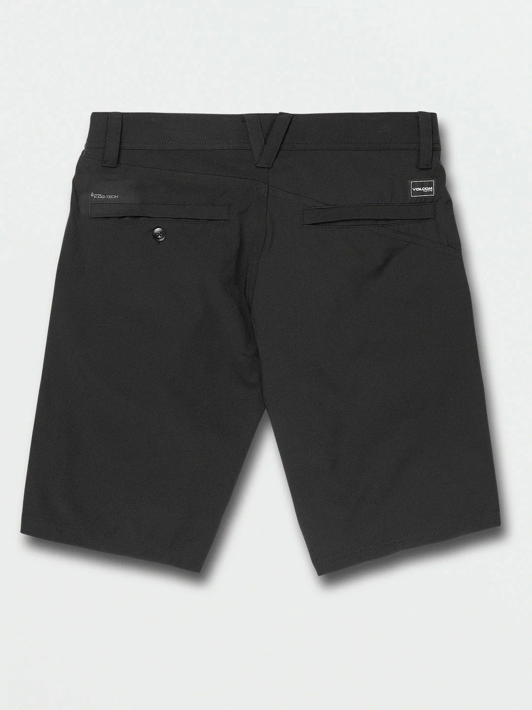 - fixed waist hybrid, Recycled plastic buckle button center front closure, Front hand pocket with coin catch, and hidden right invisible zip stash pocket, Signature asymmetrical back single welt pocket, high density Volcom brand logo