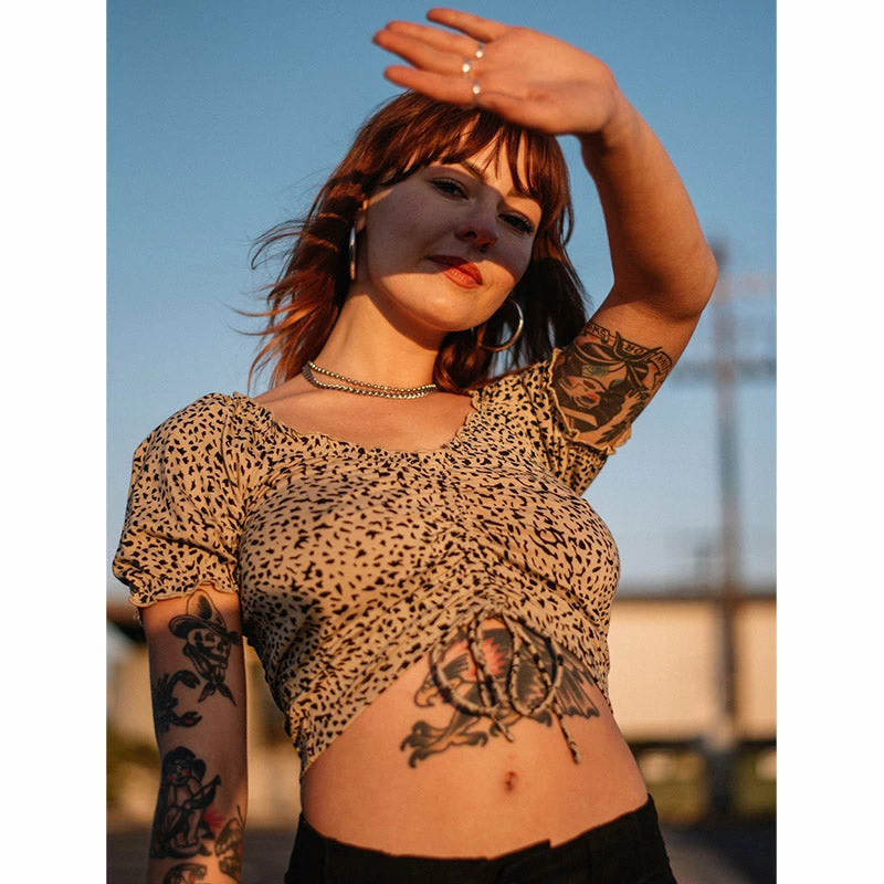- Crop top with puff sleeve and cinch front detail